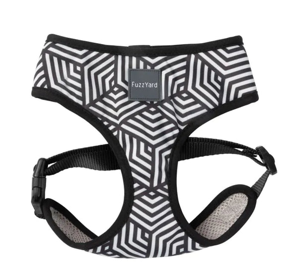 Inspired by the honeycomb structure of beehives, this design explores the repetition discoverable throughout nature. This sleek, black and white geometric design will add a touch of luxury to your day. Walk in style with a FuzzYard adjustable Dog Harness.